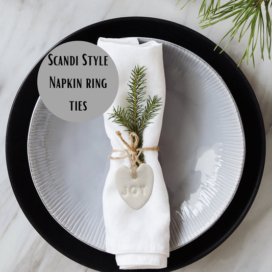 White Ceramic Hanging Decorations, Set of 4 Hand Stamped Ho Ho Ho, Cheer, Wish, Love, Mini Nordic Style Christmas Gift Tags or Napkin Rings