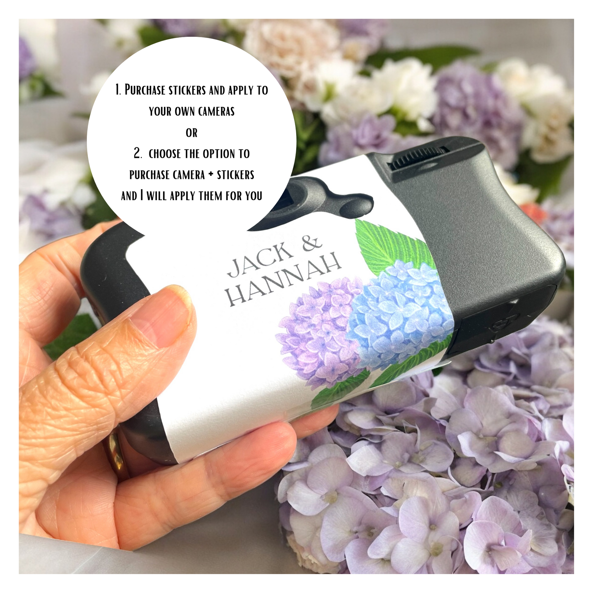 Add a touch of elegance to your big day with these Personalised Wedding Camera Stickers with Blue & Purple Hydrangeas! Designed for Kodak FunSaver disposable cameras, these floral labels bring a beautiful and personalised detail to each table, inviting guests to capture candid memories. Featuring delicate blue and purple hydrangeas, these stickers complement any wedding theme, from rustic to garden-inspired. Just peel and stick onto your cameras for an easy, custom decor element that enhances your wedding's unique style. Perfect for wedding receptions, bridal showers, and special events where every memory counts!
