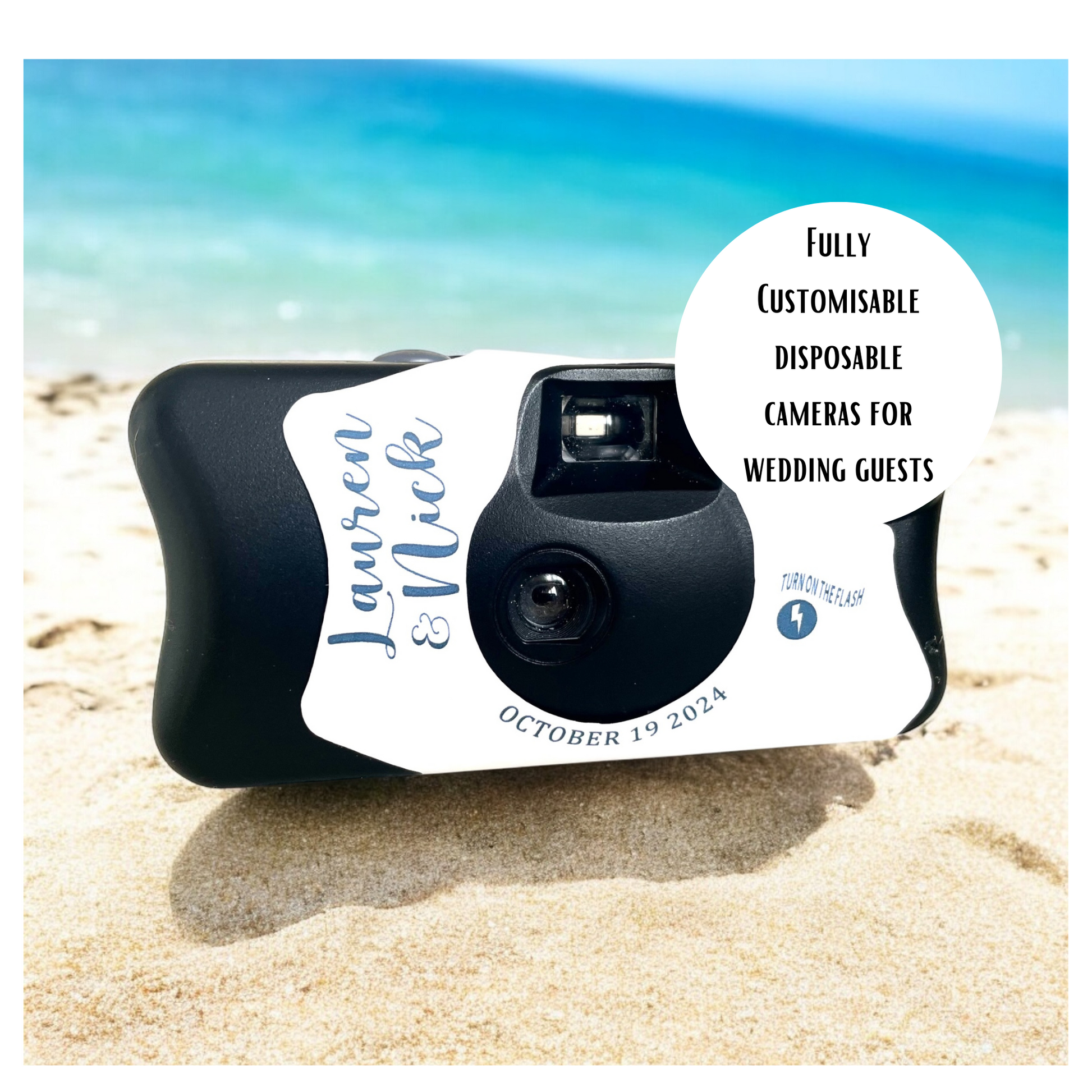 Add a coastal touch to your destination beach wedding with our Navy Blue Waves Disposable Camera Stickers! Perfect for beach-themed celebrations, these elegant stickers feature navy blue wave design that beautifully complements the ocean backdrop. Personalised to match your unique wedding style, these stickers are easy to apply to your disposable cameras, inviting guests to capture stunning, candid moments throughout your special day. Whether you're tying the knot by the sea or celebrating your love in a beach-inspired venue, these custom camera stickers make a perfect addition to your beach wedding decor!
