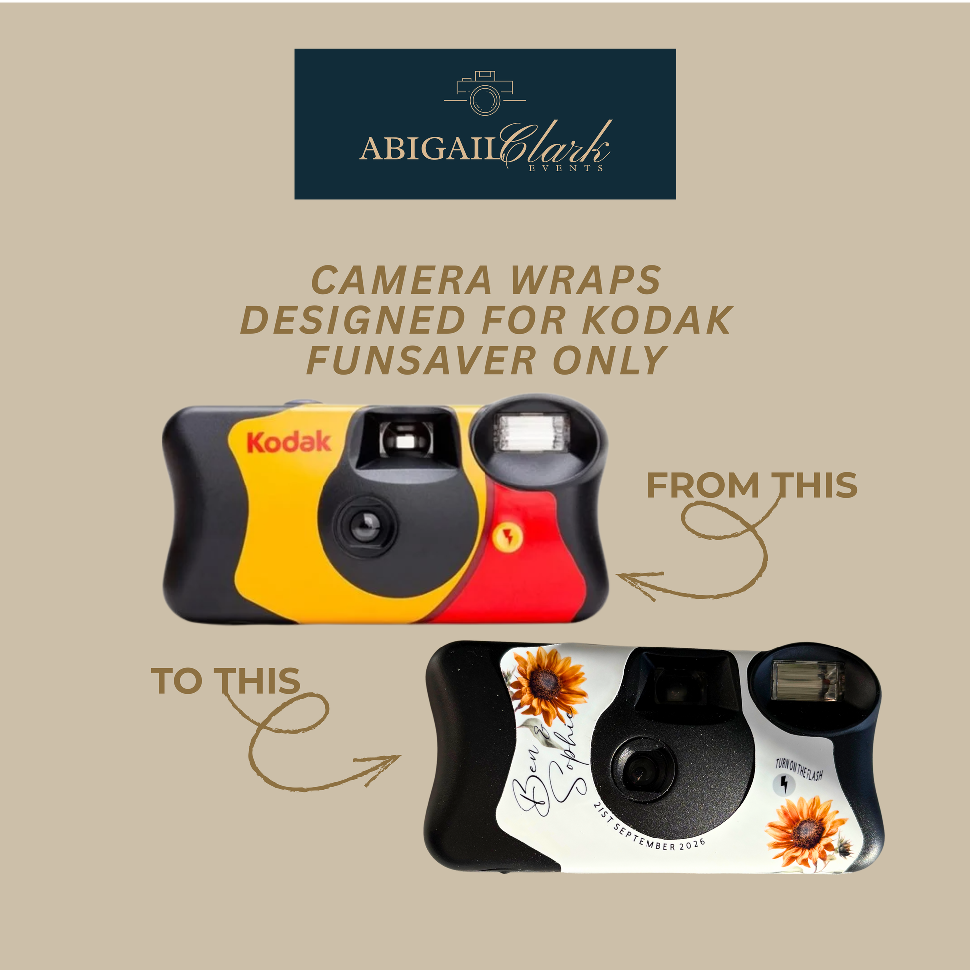 Add a warm, nostalgic detail to your wedding day with these personalised sunflower wedding disposable camera wraps, designed to encourage guests to put their phones away and capture genuine, candid moments on film.